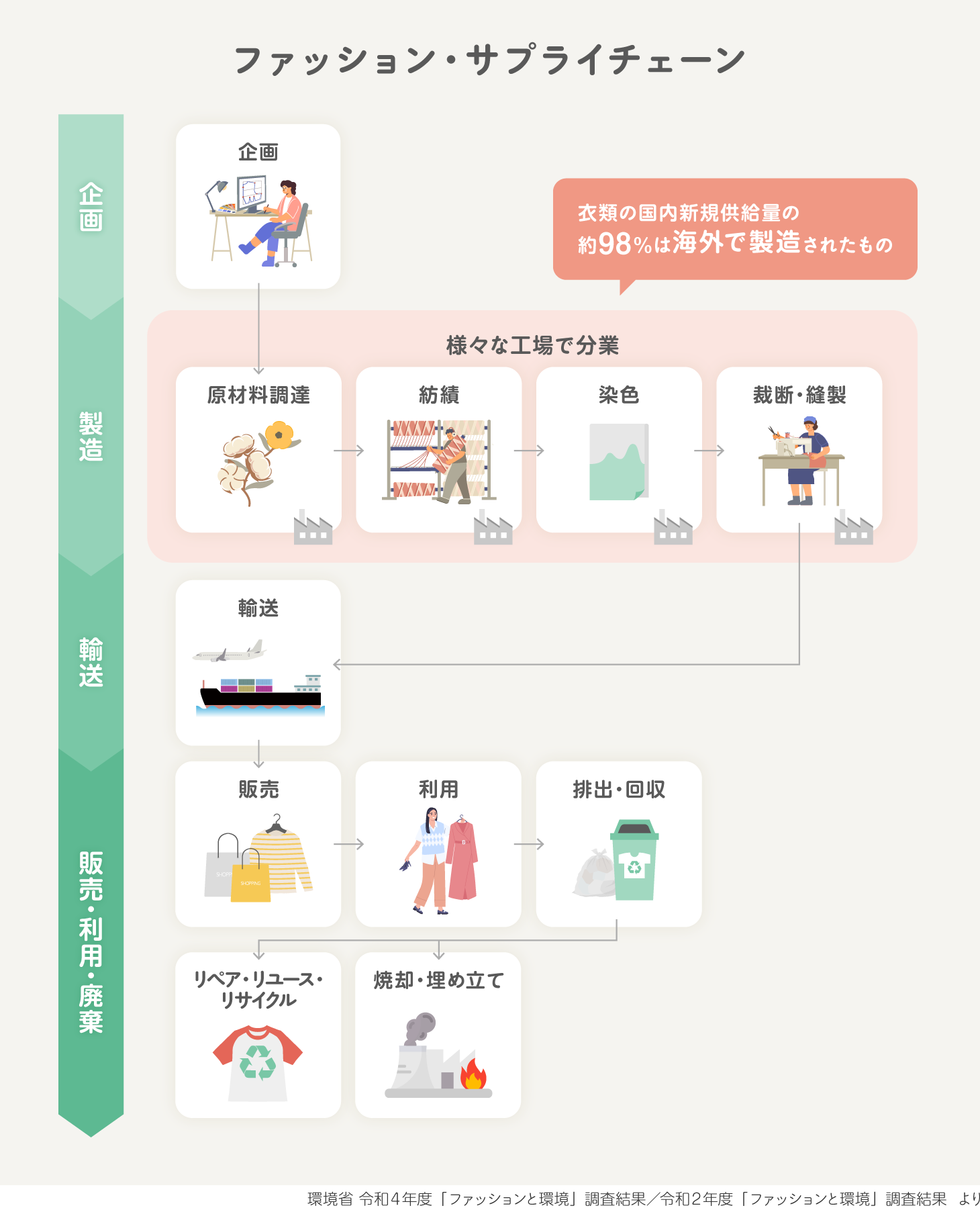 ファッション業界のもう1つの特徴は「サプライチェーン(※)が長く複雑」な点にあります。「より安く、より多く」を追い求めていった結果、かつて国内にあった工場は賃金の安い海外へと移され、業界全体のグローバルな分業化が進んでいきました。サプライチェーンが長く複雑になったことで、現在流通している既成服の多くは、どんな原料から、どこで、どんな風にして作られた衣服なのか、ひと口には言えないものがほとんどだと思います。