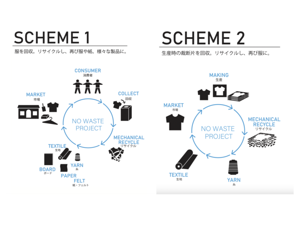 土屋:「NO WASTE PROJECT」というファッションのリサイクルを実現するための仕組みを提供しています。これは、製品を作る際にどうしても発生してしまう生地の裁断くずや店頭で回収した衣服を繊維に戻し、再び糸や生地、衣服に生まれ変わらせるという循環を作り出すものです。国内では、スノーピークさんやしまむらさんにNO WASTE PROJECTのスキームを活用していただいており、店頭で回収した商品を、衣服やノベルティ、ショッパー、リーフレットなどにリサイクルしています。