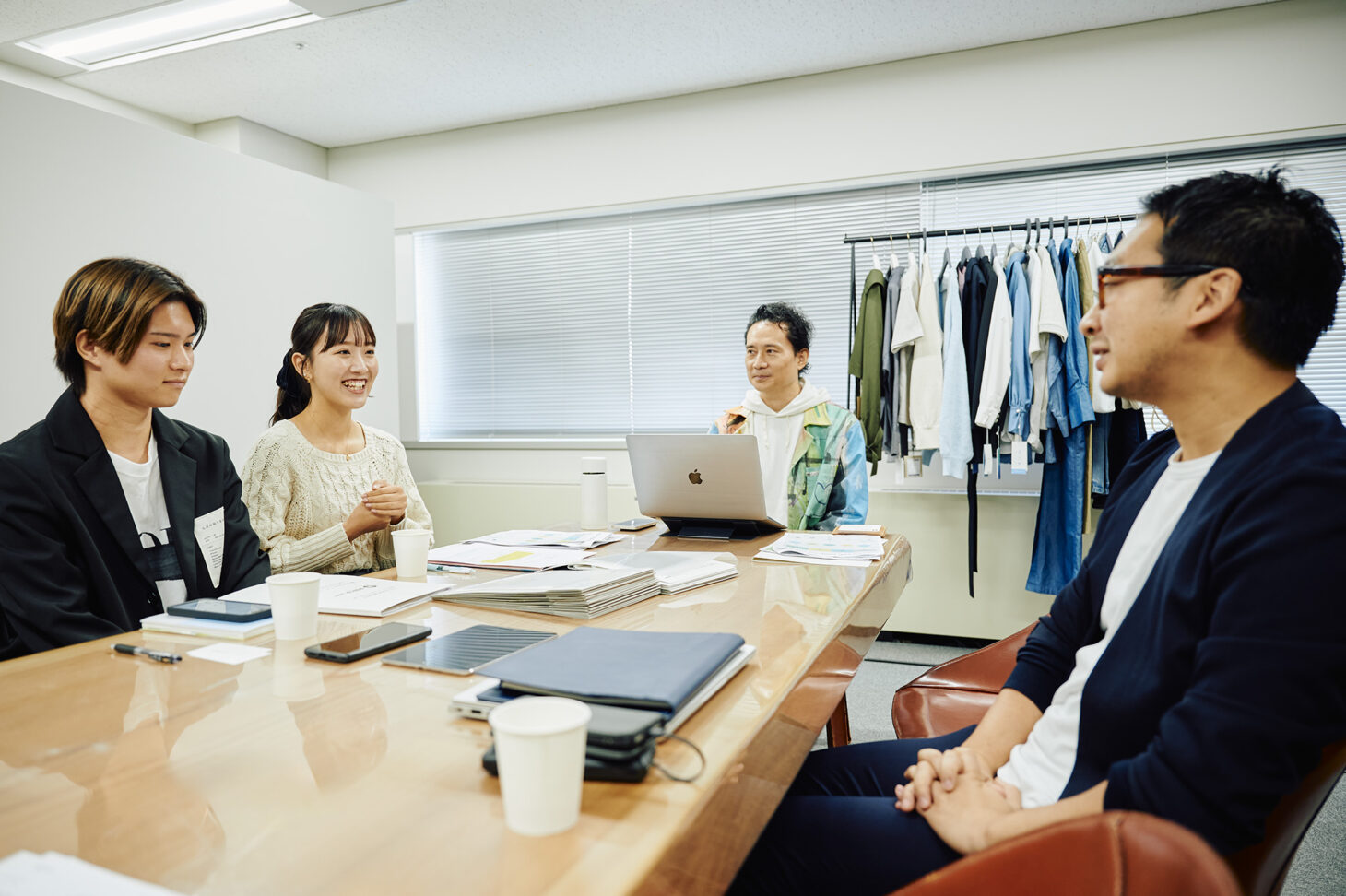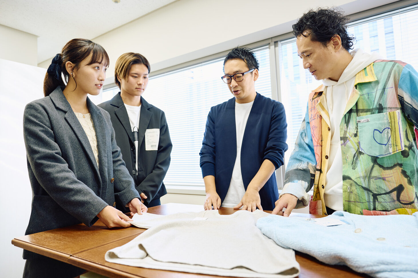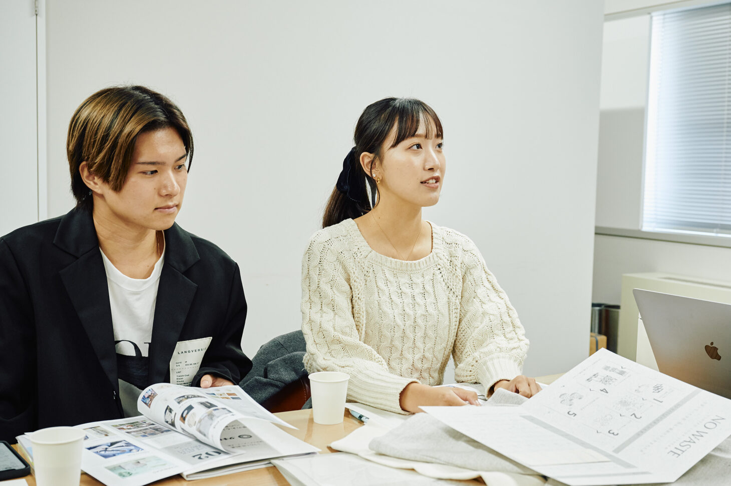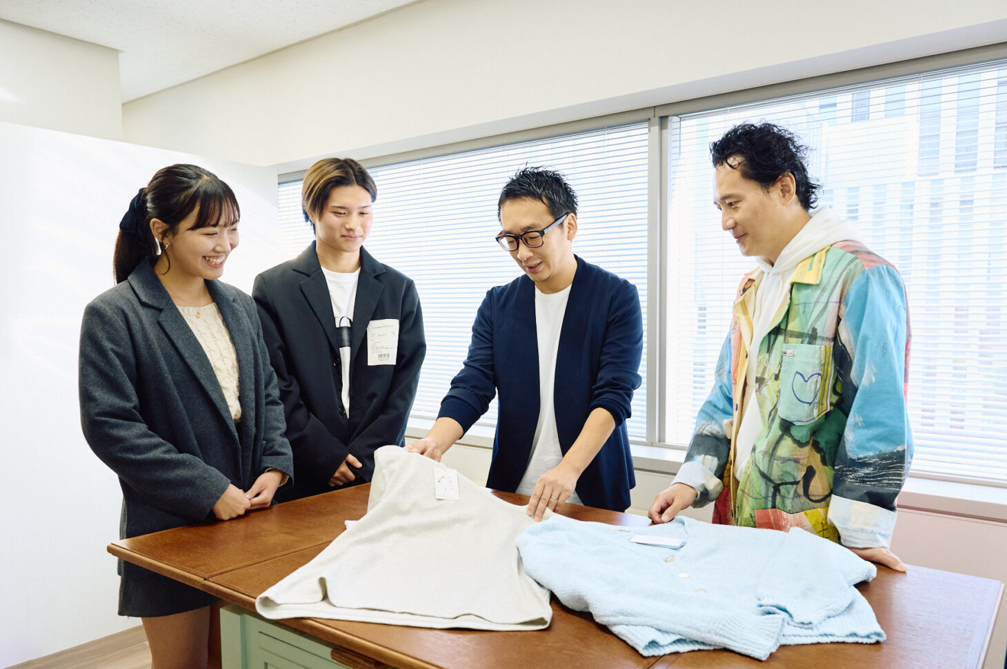 取材後も続いたディスカッション。土屋さんと坂口さんからは、例えば学園祭のチームTシャツをサステナブル素材で作って、その後10年間使い続けられるようなものにするにはどんなデザインにするといいのか、ということを仲間と一緒に考えてみる。エシカルファッションの実践は、そういうわくわくするようなクリエイティビティを発揮するチャンスなのではないか、というアドバイスを勅使河原さんと白井さんに送っていました。