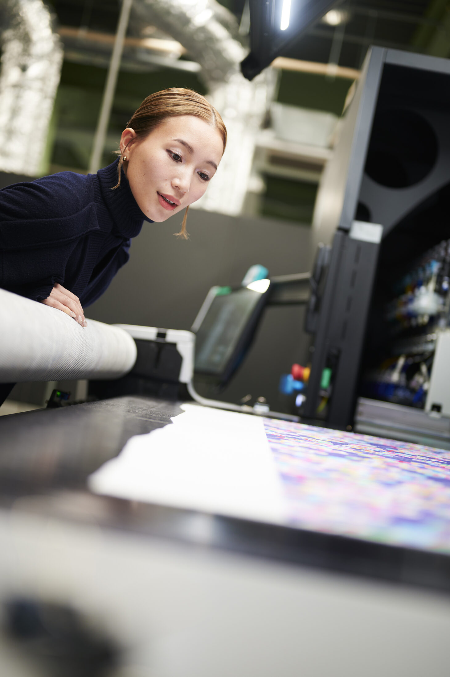 また、この印刷機では、麻や絹、ナイロンなど、従来の印刷機では印刷が難しかった素材にも、鮮明に印刷をすることができます。線画で書いたような繊細な表現や、生地への塗布が難しいとされていた白インクも印刷することもできるので、これまでにない新しい表現が可能になります。適量かつエシカルな方法で、自由に服作りをしたいという気持ちを持っているデザイナーさんは今多くいると思うのですが、そういった方たちの役に立つものになってほしいと思っています。