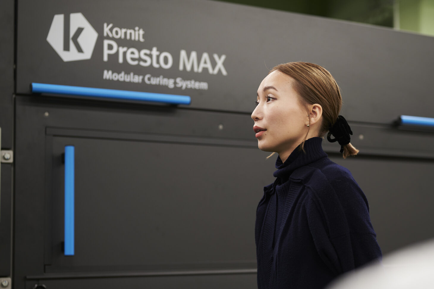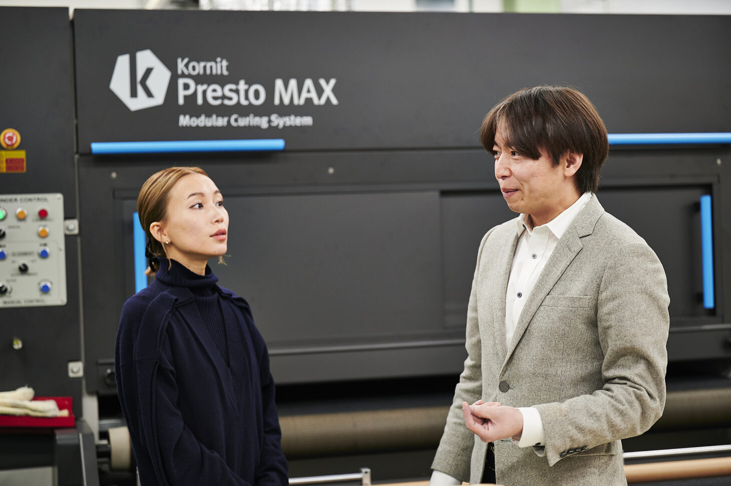 O-Perspectiveの核となるイスラエルのKornit Digital社製のプリンター「Presto」。従来のインクジェットプリンターでは困難だった色付き生地への白インクプリントや、ポリエステルや麻などの素材へのプリントも風合いを損なうことなく可能