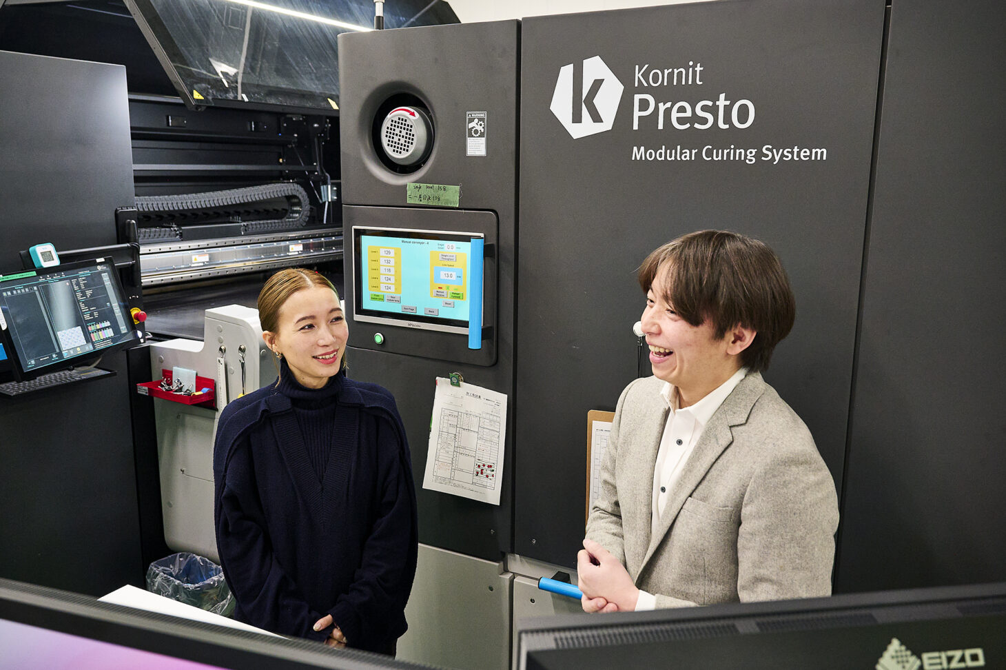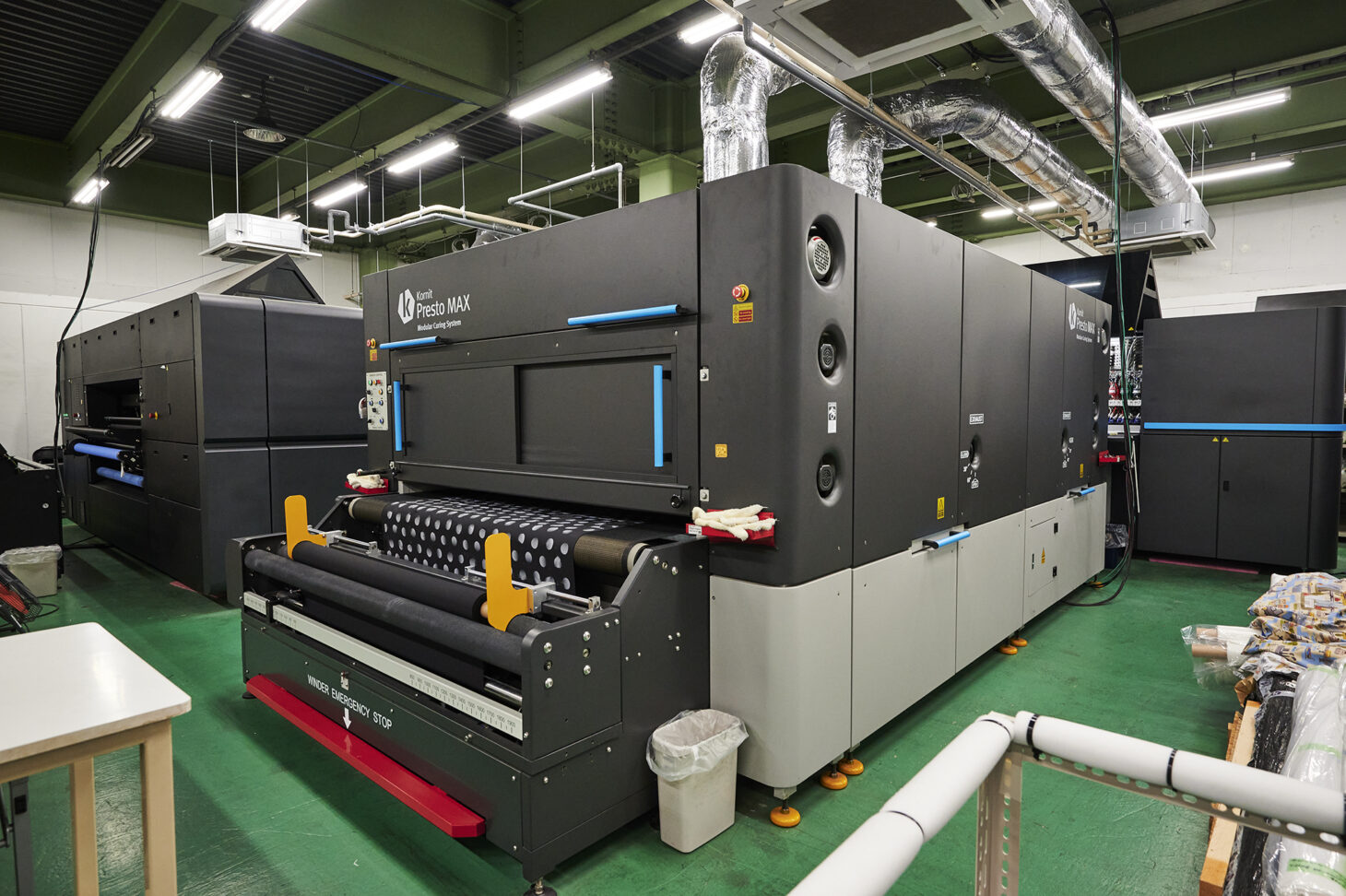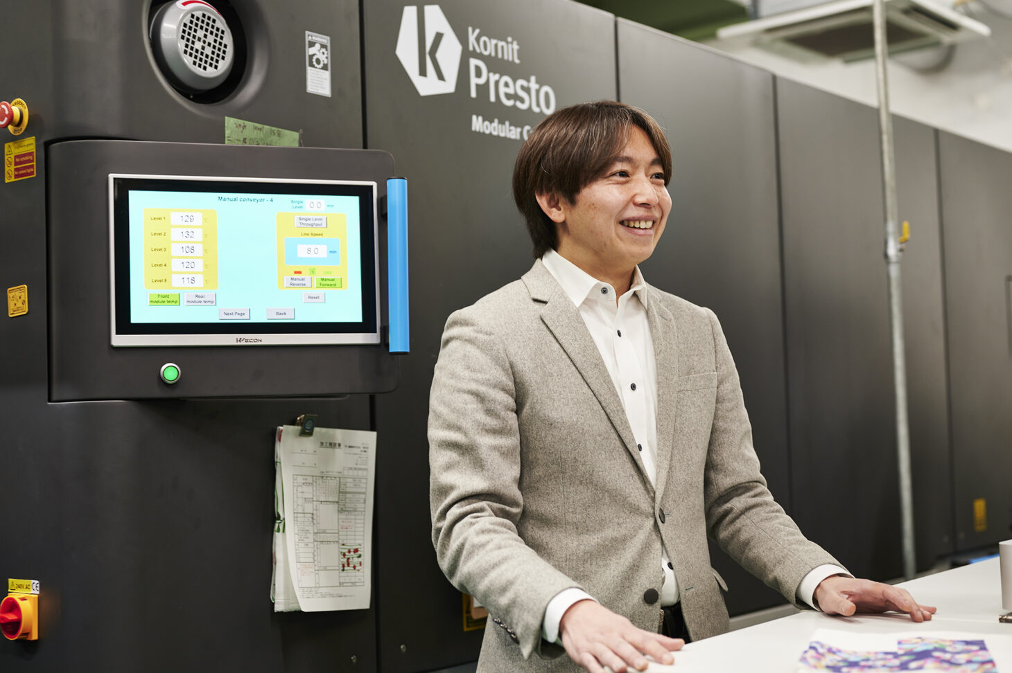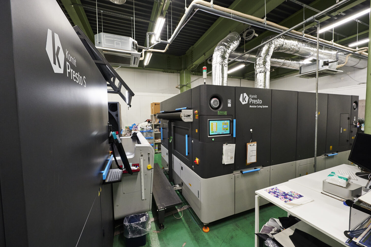 印刷機の後ろに設置されているのは、専用の乾燥機。通常は印刷の後に蒸しと水洗といった工程が必要になるが、Prestoではそれらが不要になるため、排水を発生させないだけでなく、省スペースかつ省エネルギーで生産を行うことが可能