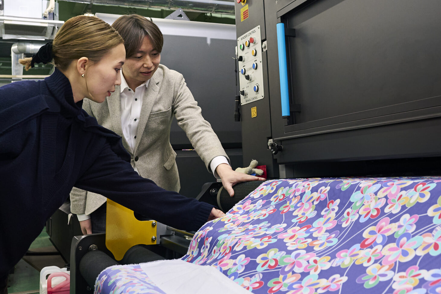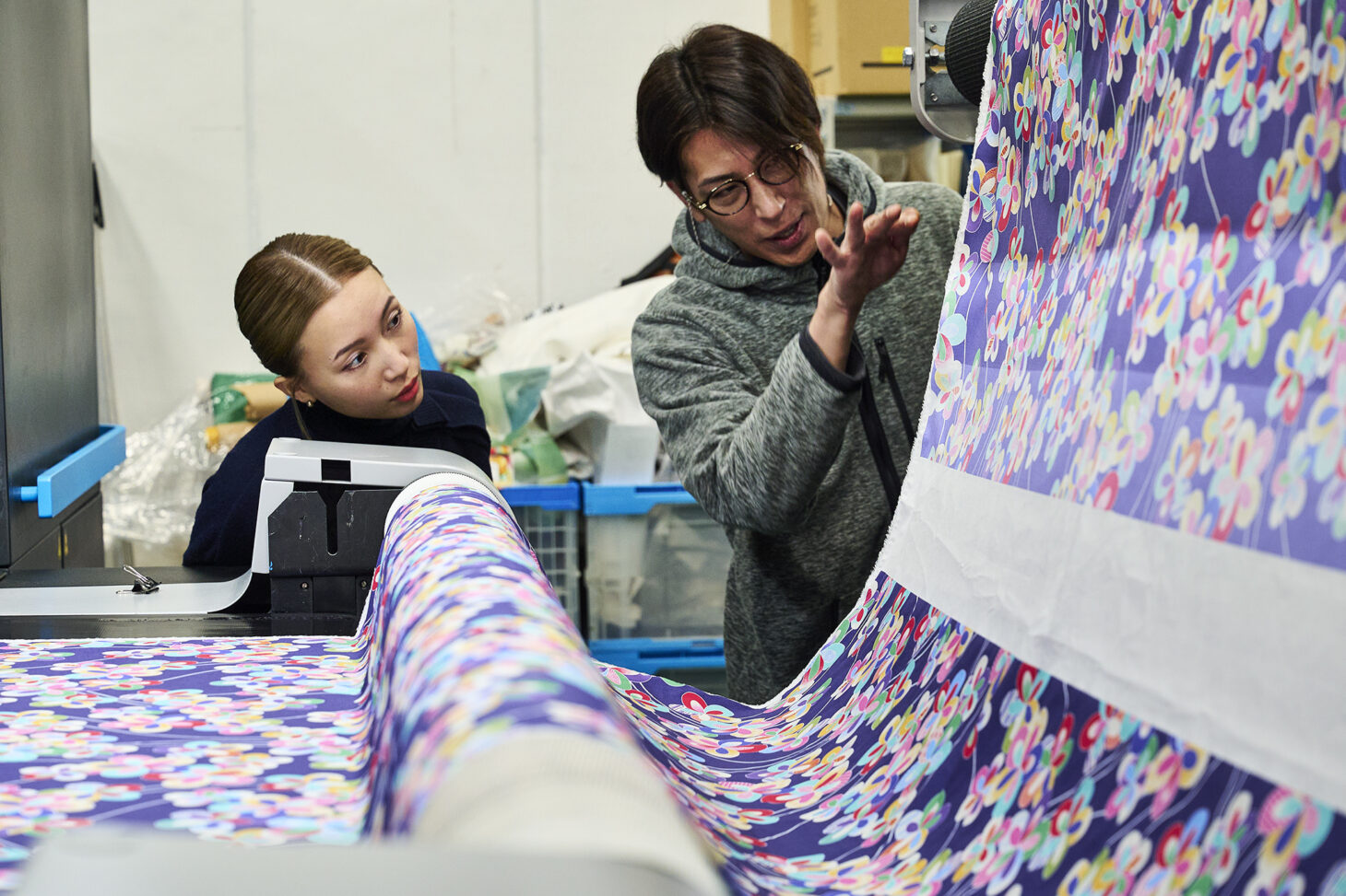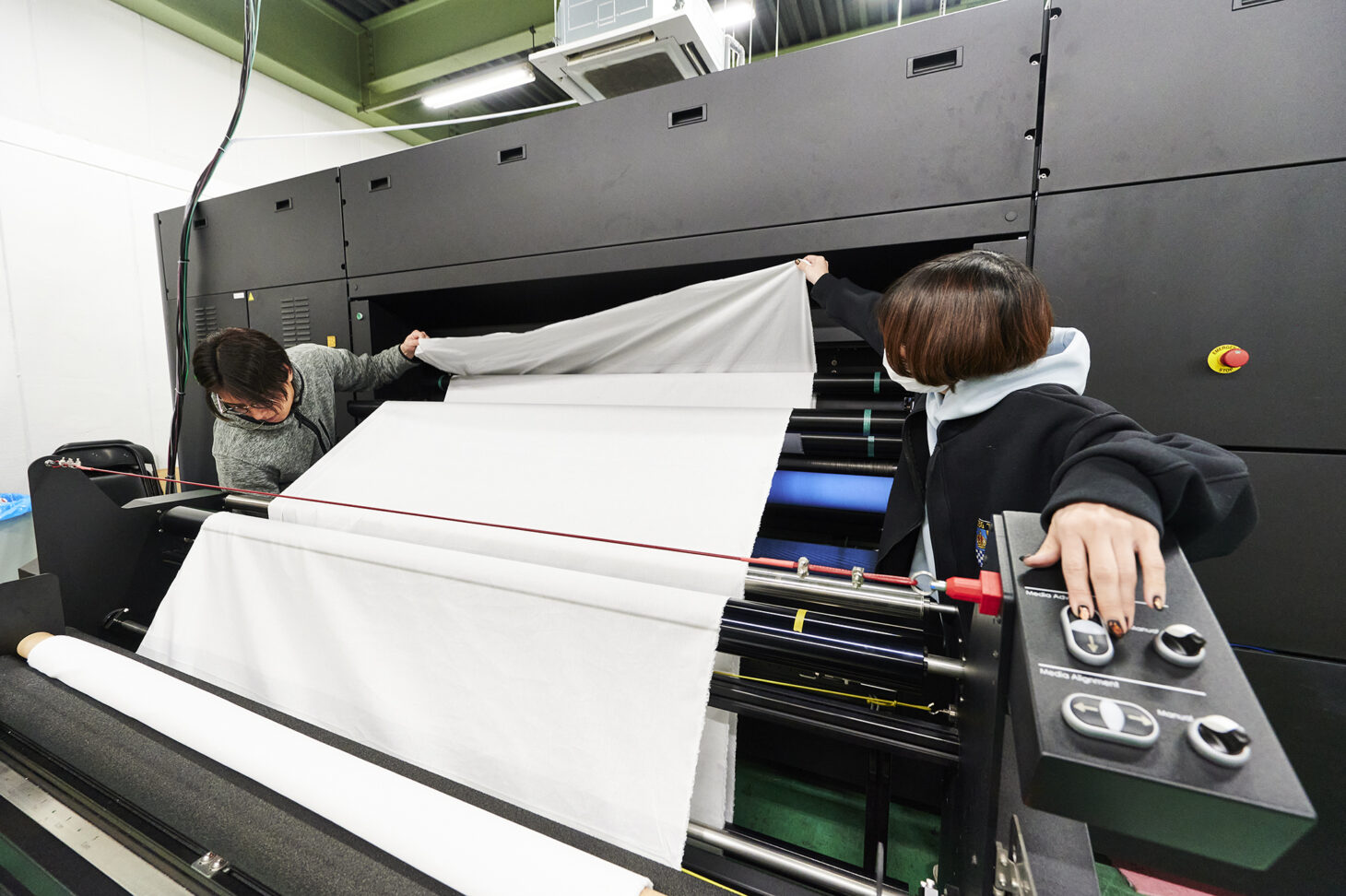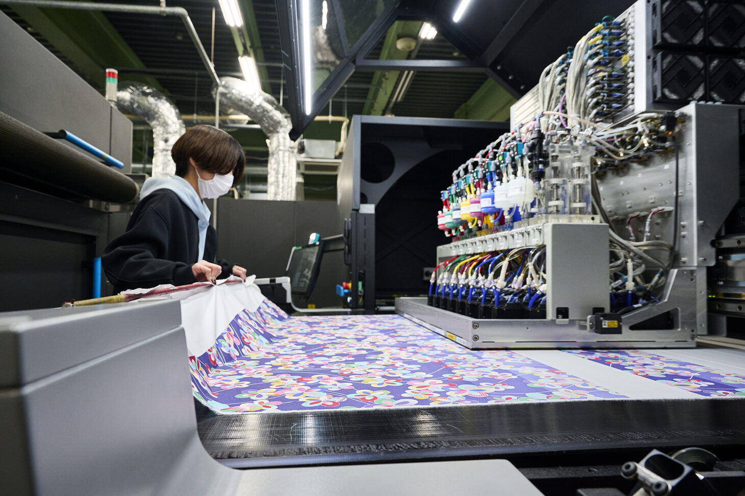 印刷機への生地の差し込みや、印刷のオペレーションと品質確認、印刷された生地を乾燥機へ送る作業などはすべて手作業で行われます