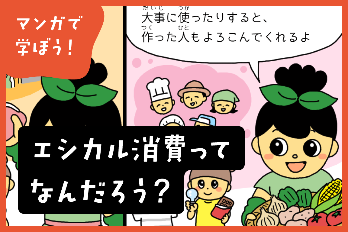 作中に登場するのは、子ども環境情報紙「エコチル」のキャラクター「エーコちゃん」。エシカル消費のポイントや大切さなどを、子どもから大人まで分かりやすく学べる内容です。
