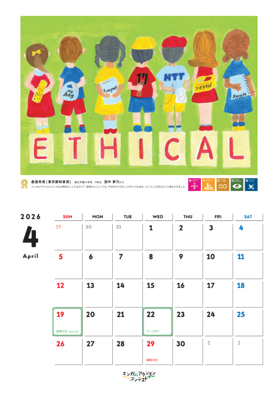 各入選作品はオリジナルカレンダーに掲載し、都内の全小学校約1,400校へ配布いたします。校内での掲示を通じて、子どもたちにエシカル消費への関心を高めることが期待されるとともに、各イラストに関連するSDGs目標も紹介し、社会課題とのつながりや自分にできる行動を考えるきっかけを生み出す工夫も凝らされています。