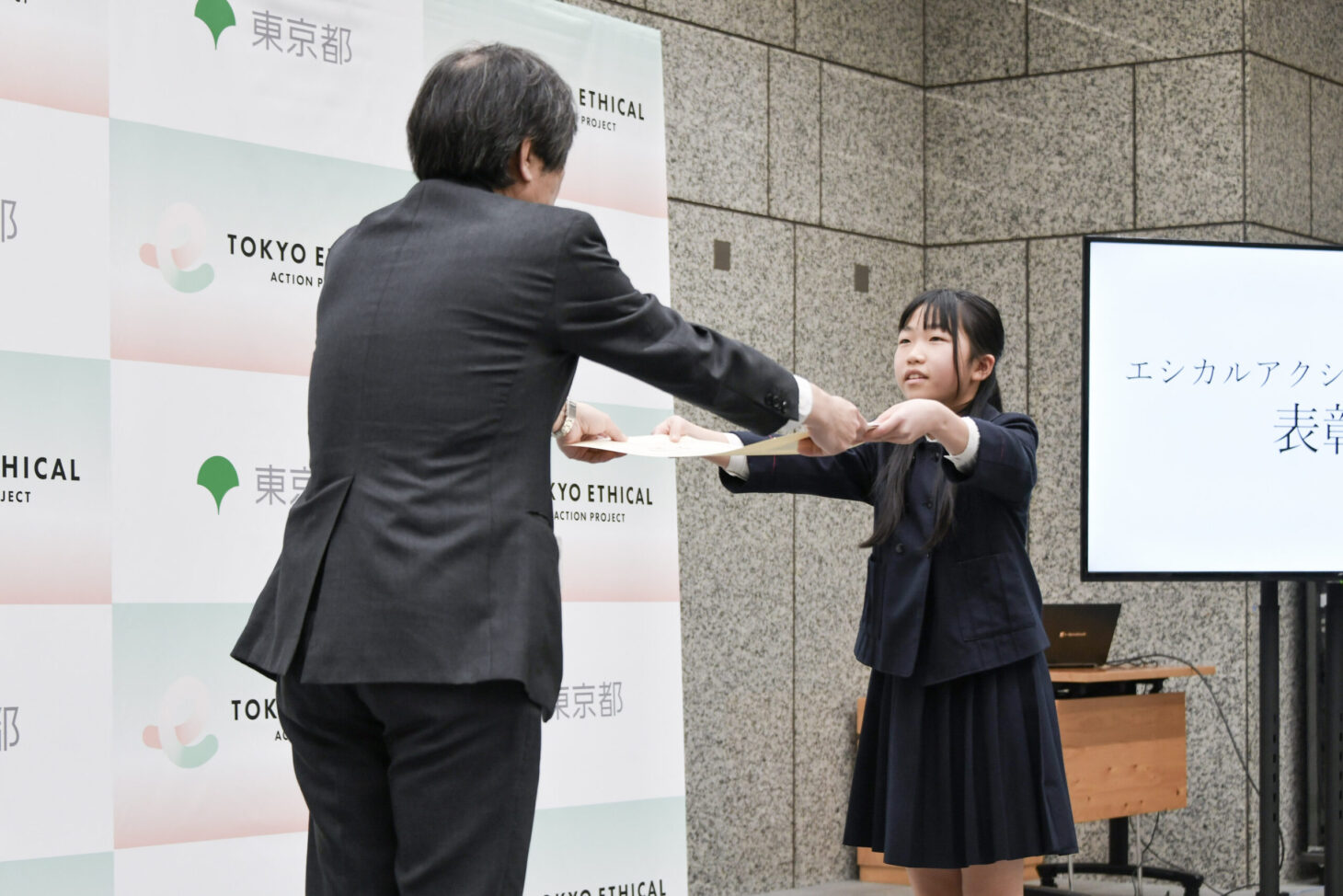 令和8年2月18日(水)に東京都庁において「エシカルアクションコンテスト」表彰式を開催いたしました。当日は受賞した12名の子どもたちとその保護者が出席し、賞状を手にした子どもたちの晴れやかな笑顔が会場に広がった特別な一日となりました。