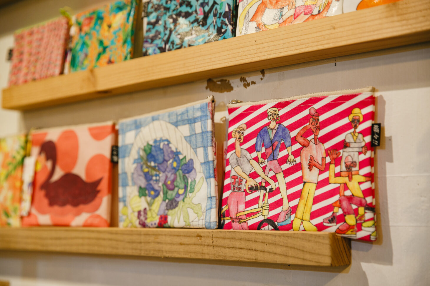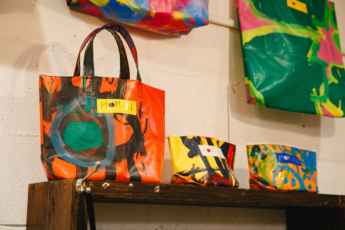 古いテントの生地を再利用し、ハンドペイントを施したバッグやポーチ