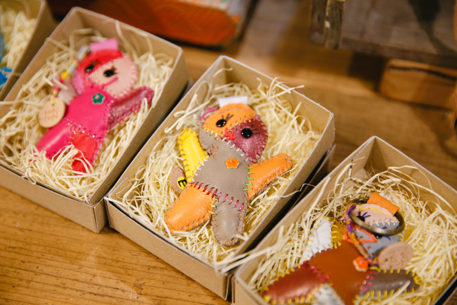 レザーの端切れを一針一針縫いとめたキーホルダー