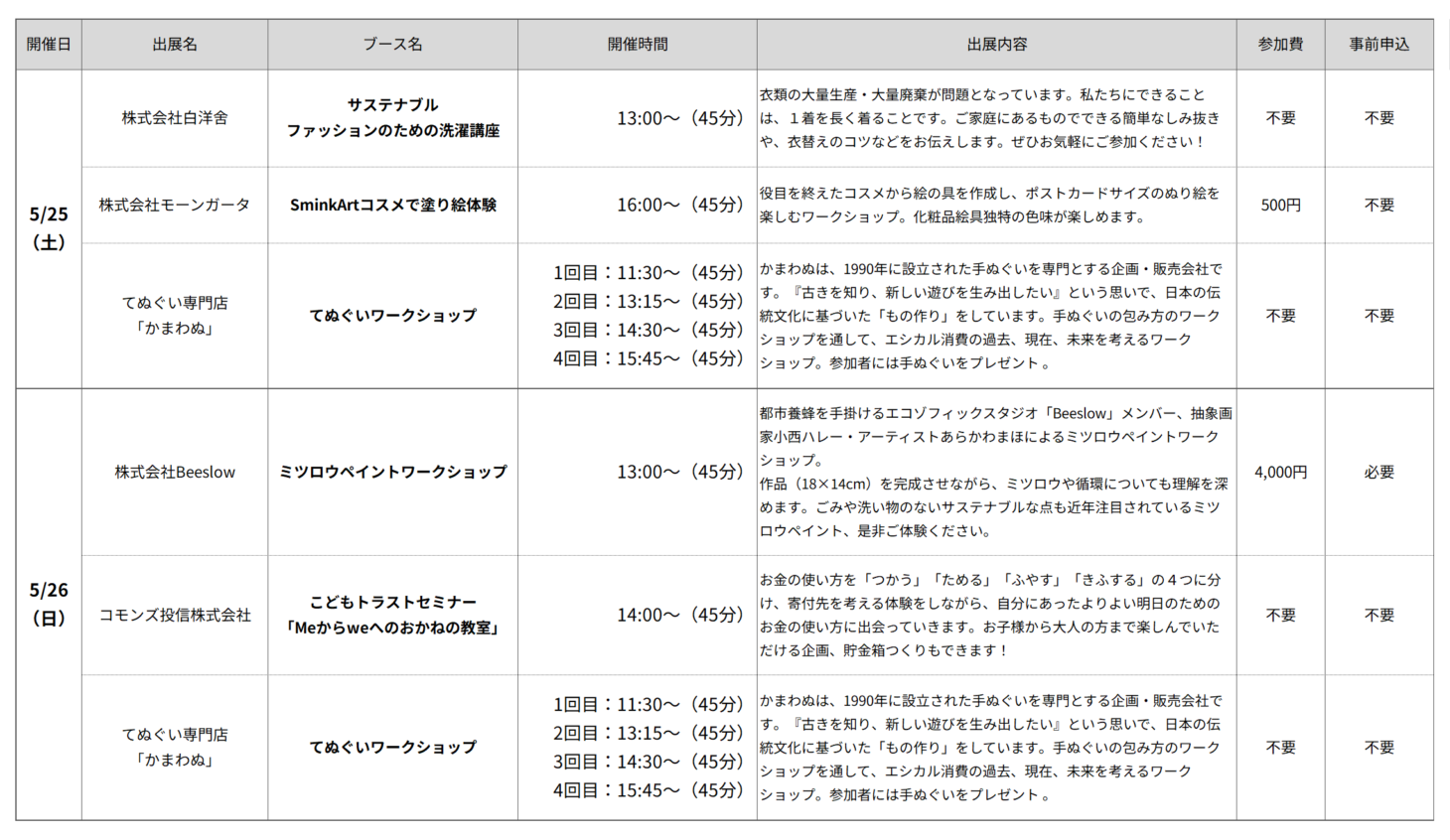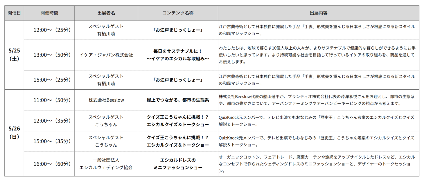 エシカル消費に取組む企業・団体によるトークセッションや、エシカル視点のアップサイクルなファッションショー、テレビ出演でもおなじみのこうちゃんさん考案のエシカルクイズなど魅力的なイベントを実施予定です。