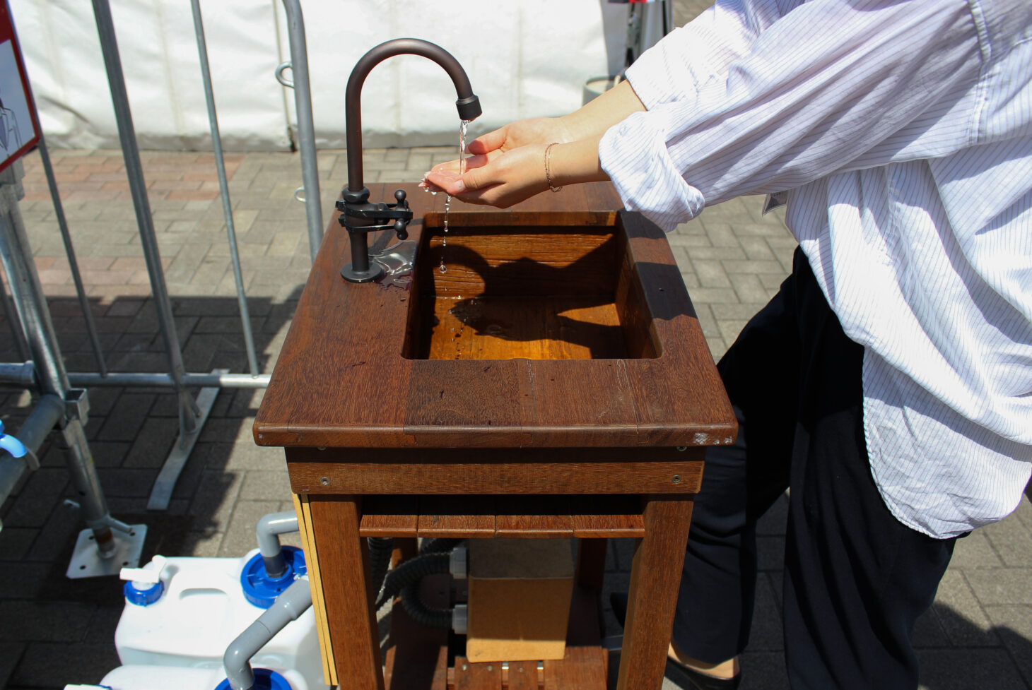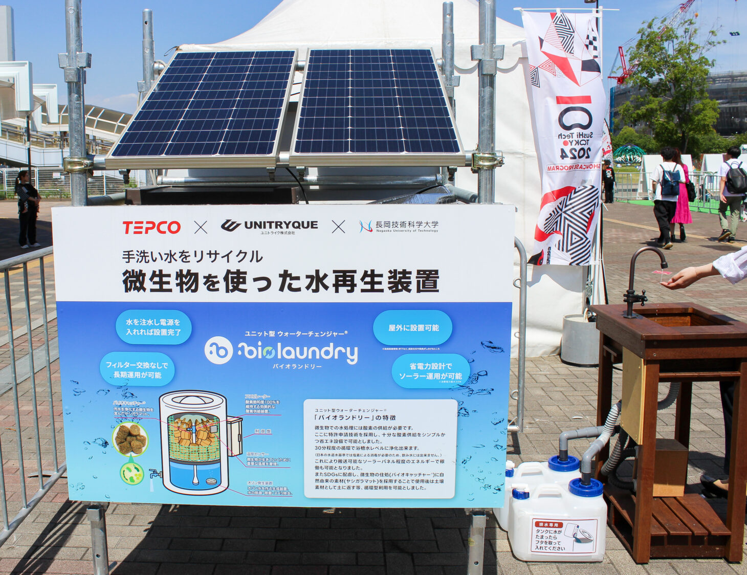 こちらはユニトライク株式会社の雨水や川の水を微生物の力で浴槽水レベルに浄化できる「バイオランドリー」という装置。長岡技術科学大学と東京電力ホールディングスの共同研究による浄水システム「ウォーターチェンジャー®」を商品化したものです。水道が止まった被災地などで活躍しています。会場では実際にこの装置で手を洗うことができました。