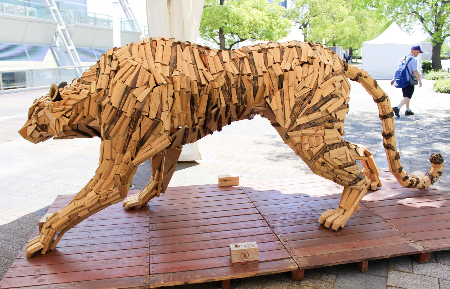 会場であるシンボルプロムナード公園では随所で写真のようなアート作品が展示されていました。こちらは町で出た廃材などを利用してできたものです。すべてのアート作品は売り物として出品されています。今後、それぞれのアート作品が新しい場所を見つけ人々を楽しませていくことでしょう。