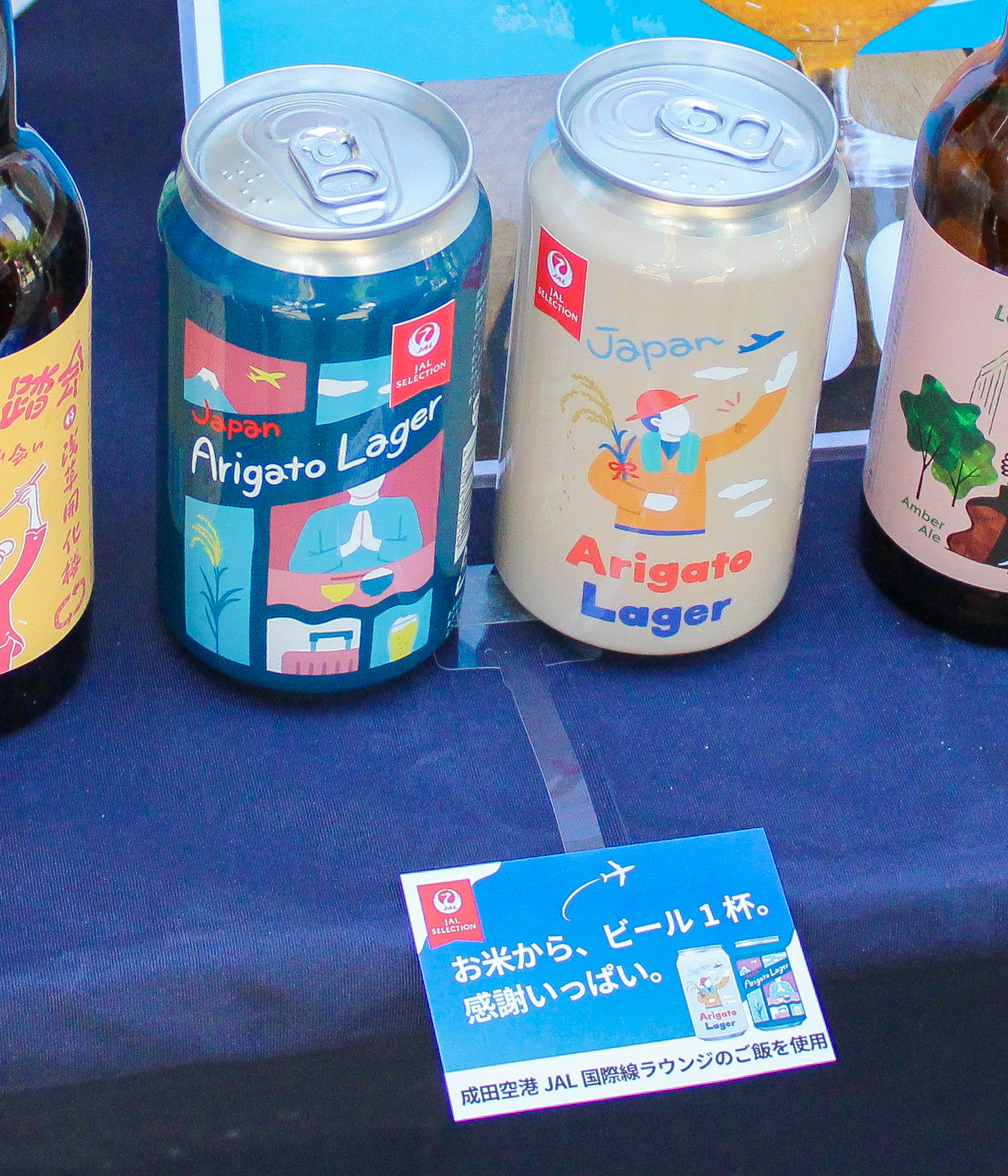 こちらはJALがビール会社とコラボすることでできた「Japan Arigato Lagar」というビール。成田空港JAL国際線ラウンジで余ったお米をアップサイクルしてできたサステナブルなビールです。ドライでキレがあり、ホップのフルーティーな香りを楽しめます。