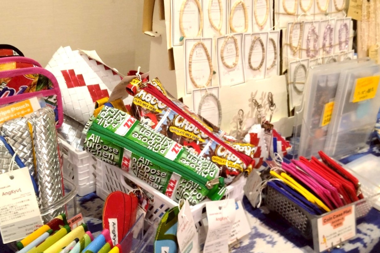 雑貨ブランドの「AngKyut(アンキュート)」はお菓子や肥料の袋のアップサイクルをして作られているほか、アクセサリーブランド「NINDOT(ニンドット)」では、プラスチック素材が日用品の主流となり、自然素材のものが手に入りにくい傾向のあるフィリピンで、貝や木などのパーツ加工に取り組む店舗や人との交流を通し素材を調達。